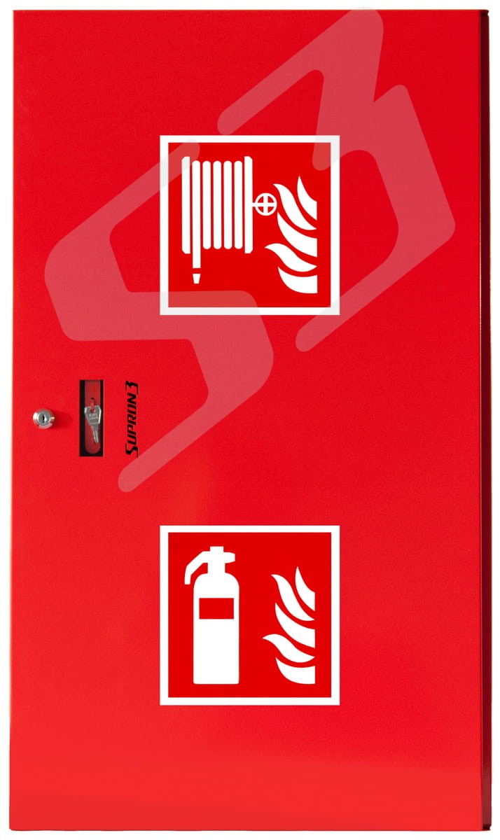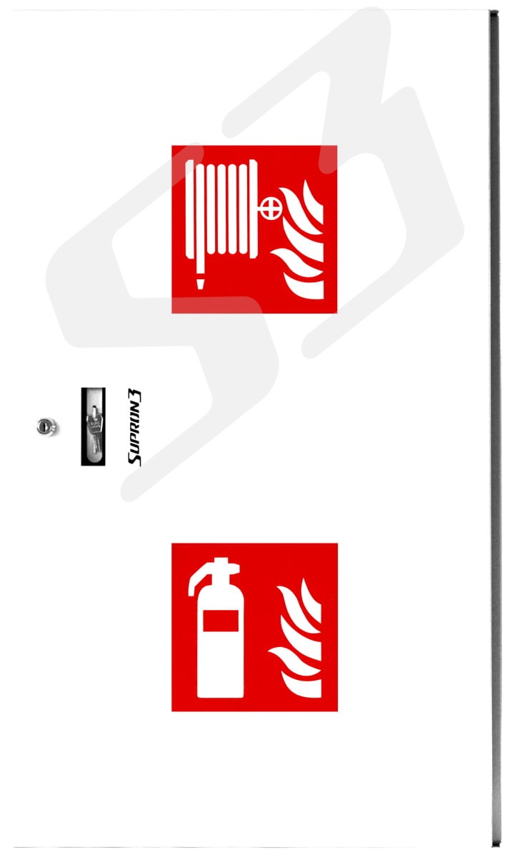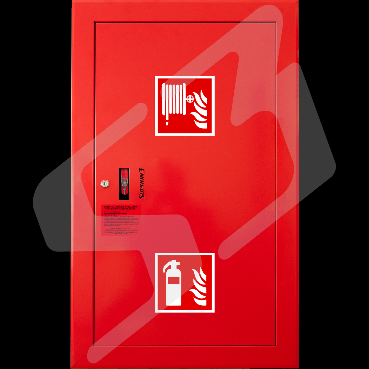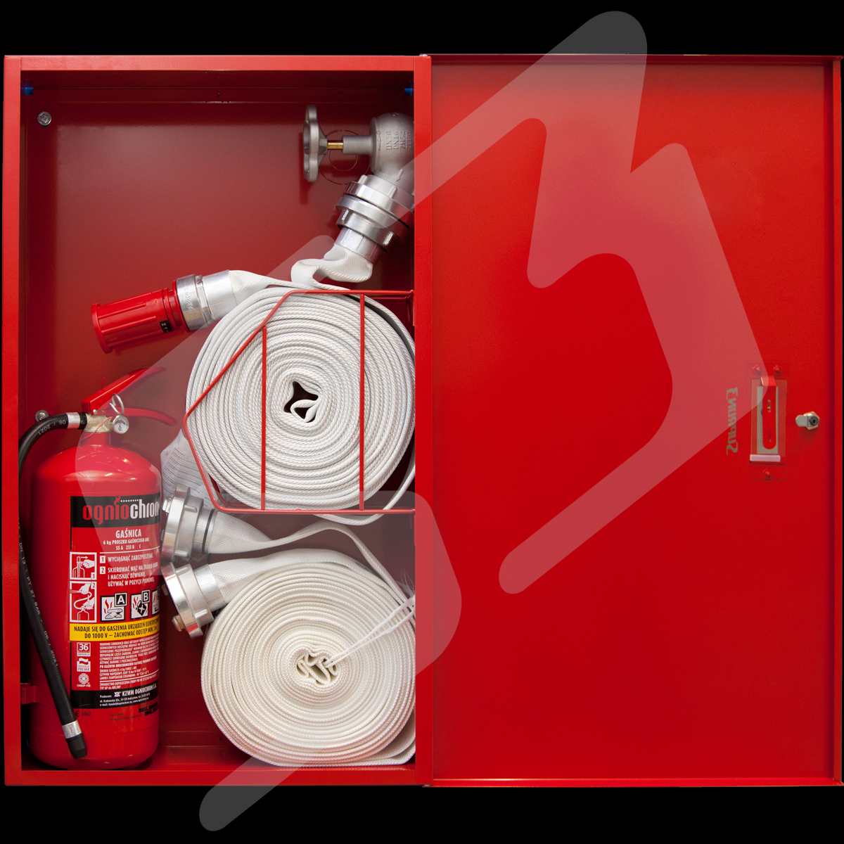 Hydrant wewnętrzny z dwoma wężami półsztywnymi 52 mm o długości 15 m z miejscem na gaśnicę (solo) uniwersalny z koszem.