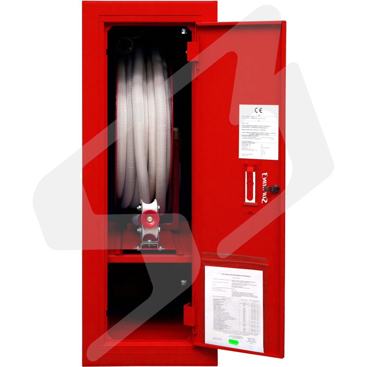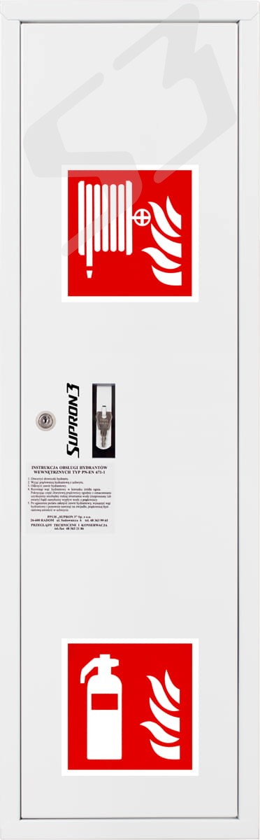 Hydrant wewnętrzny z wężem półsztywnym 25 mm o długości 30 m wykonanie boczne z miejscem na gaśnicę.