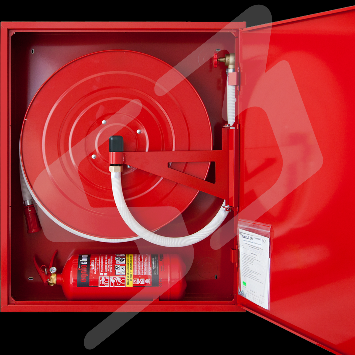 Hydrant wewnętrzny z wężem półsztywnym 25 mm o długości 30 m z miejscem na gaśnicę pod zwijadłem.