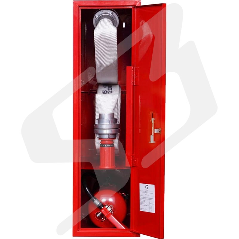 Hydrant wewnętrzny zawieszany z wężem płaskoskładanym 52 mm o długości 15 m ułożonym w koszu z miejscem na gaśnicę 6 kg wykonanie boczne.