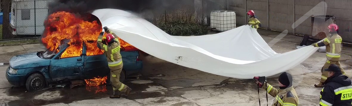 Płachta o wymiarach 6x8m pozwala na pokrycie pojazdu typu SUV i może być stosowana do gaszenia poprzez odcięcie dostępu tlenu do pożaru samochodu